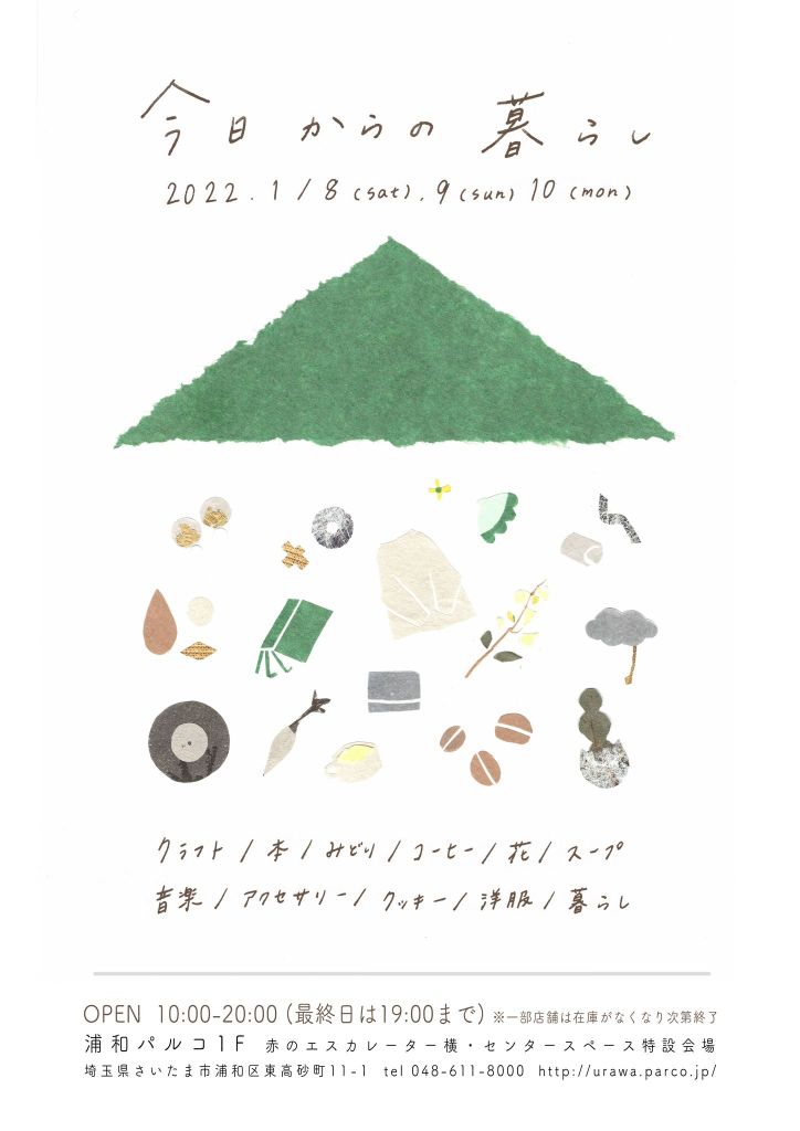 実際、彼女が手がけたのは、江澤さんが企画・運営する浦和パルコで開催されたマーケット「今日から の暮らし」のデザイン。浦和パルコで開催されたことを考えると、デザイン事務所で言えば決して小さくな い案件と言ってもいいかもしれません。でもそれは実際使用されたデザインをみると納得してしまいま す。